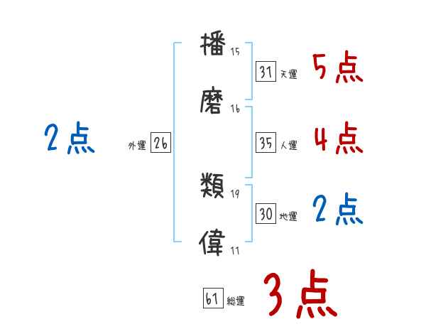 天運![]() | 播磨類偉さんの天運は31画の5つ星!社交性があり判断力に優れる。順風満帆な人生で円満な生活。 家系が持つ宿命的な運勢を表します。祖先から受け継いだ苗字ですので自分の力が及びません。家柄を象徴します。 |