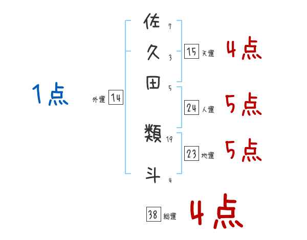 天運![]() | 佐久田類斗さんの天運は15画の4つ星!人徳があり出世する。順調に物事を進め円満な人生。 家系が持つ宿命的な運勢を表します。祖先から受け継いだ苗字ですので自分の力が及びません。家柄を象徴します。 |