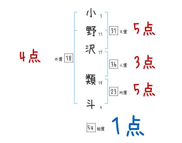 総運![]() | 小野沢類斗さんの総運は54画の1つ星!トラブルが多いかも。周りをよく見て協調して過ごしましょう。 あなたの人生を表す1番重要な運勢です。生涯を通じて影響する総合運となり、主に50歳以降の晩年期に影響を及ぼします。 |