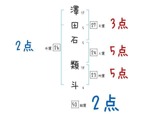 外運![]() | 澤田石類斗さんの外運は26画の2つ星!波瀾万丈かも。信頼できる人を大事にしましょう。 生活面を象徴する運勢です。外部から受ける影響力を表し、結婚運、家庭運や職場、環境への順応性を表します。 |