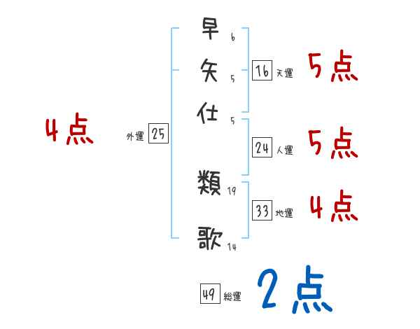 天運![]() | 早矢仕類歌さんの天運は16画の5つ星!人望が厚く大きく発展する。逆転成功が見える。 家系が持つ宿命的な運勢を表します。祖先から受け継いだ苗字ですので自分の力が及びません。家柄を象徴します。 |