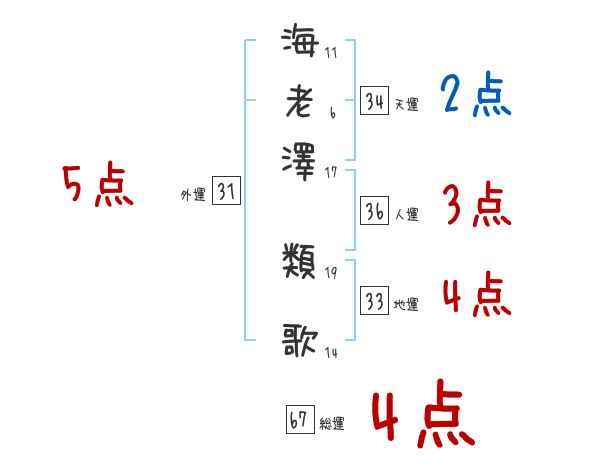 外運![]() | 海老澤類歌さんの外運は31画の5つ星!社交性があり判断力に優れる。順風満帆な人生で円満な生活。 生活面を象徴する運勢です。外部から受ける影響力を表し、結婚運、家庭運や職場、環境への順応性を表します。 |