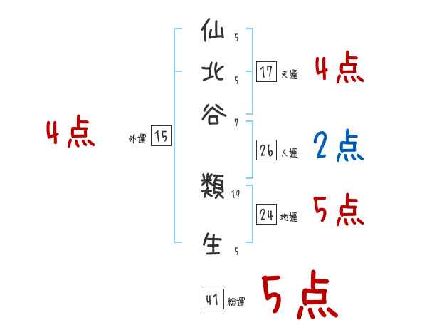 天運![]() | 仙北谷類生さんの天運は17画の4つ星!積極的な行動力。地位を気づき財産を手に入れる。純粋な心と直感力。 家系が持つ宿命的な運勢を表します。祖先から受け継いだ苗字ですので自分の力が及びません。家柄を象徴します。 |