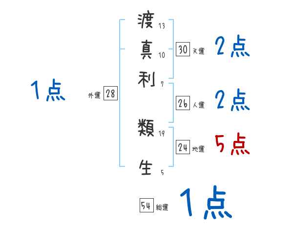 天運![]() | 渡真利類生さんの天運は30画の2つ星!浮き沈みの激しさに注意しましょう。 家系が持つ宿命的な運勢を表します。祖先から受け継いだ苗字ですので自分の力が及びません。家柄を象徴します。 |