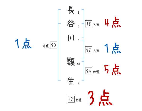 天運![]() | 長谷川類生さんの天運は18画の4つ星!情熱的で剛気。忍耐力があり信頼される。 家系が持つ宿命的な運勢を表します。祖先から受け継いだ苗字ですので自分の力が及びません。家柄を象徴します。 |