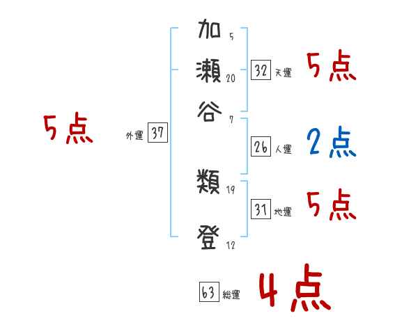 天運![]() | 加瀬谷類登さんの天運は32画の5つ星!柔軟性があり成功する。チャンスが多く金運が良い。 家系が持つ宿命的な運勢を表します。祖先から受け継いだ苗字ですので自分の力が及びません。家柄を象徴します。 |