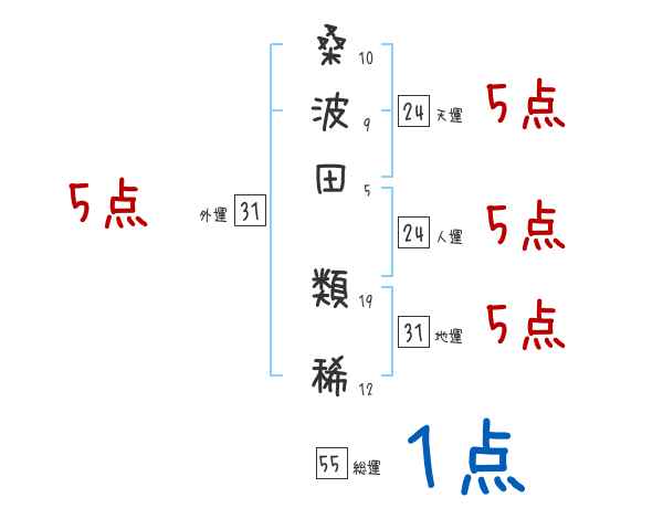 天運![]() | 桑波田類稀さんの天運は24画の5つ星!家庭運が良く順調な人生。金運にも恵まれる。 家系が持つ宿命的な運勢を表します。祖先から受け継いだ苗字ですので自分の力が及びません。家柄を象徴します。 |