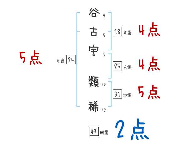 外運![]() | 谷古宇類稀さんの外運は24画の5つ星!家庭運が良く順調な人生。金運にも恵まれる。 生活面を象徴する運勢です。外部から受ける影響力を表し、結婚運、家庭運や職場、環境への順応性を表します。 |