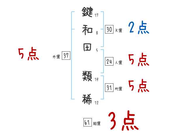 天運![]() | 鍵和田類稀さんの天運は30画の2つ星!浮き沈みの激しさに注意しましょう。 家系が持つ宿命的な運勢を表します。祖先から受け継いだ苗字ですので自分の力が及びません。家柄を象徴します。 |