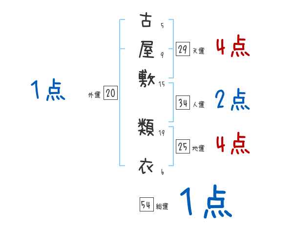 天運![]() | 古屋敷類衣さんの天運は29画の4つ星!完全主義で才能がある。厳格な心の持ち主。 家系が持つ宿命的な運勢を表します。祖先から受け継いだ苗字ですので自分の力が及びません。家柄を象徴します。 |