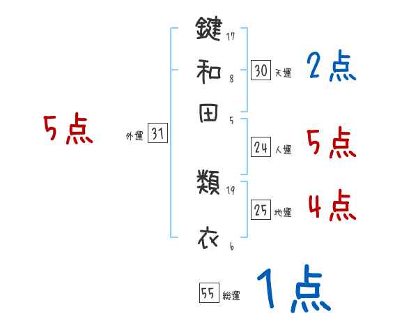 天運![]() | 鍵和田類衣さんの天運は30画の2つ星!浮き沈みの激しさに注意しましょう。 家系が持つ宿命的な運勢を表します。祖先から受け継いだ苗字ですので自分の力が及びません。家柄を象徴します。 |