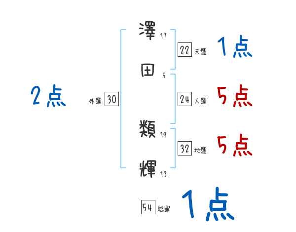 総運![]() | 澤田類輝さんの総運は54画の1つ星!トラブルが多いかも。周りをよく見て協調して過ごしましょう。 あなたの人生を表す1番重要な運勢です。生涯を通じて影響する総合運となり、主に50歳以降の晩年期に影響を及ぼします。 |