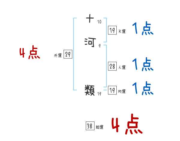 天運![]() | 十河類さんの天運は19画の1つ星!優れた才能を持ちますが、協調性が足りないことも。周りの人と協力する事を意識しましょう。 家系が持つ宿命的な運勢を表します。祖先から受け継いだ苗字ですので自分の力が及びません。家柄を象徴します。 |