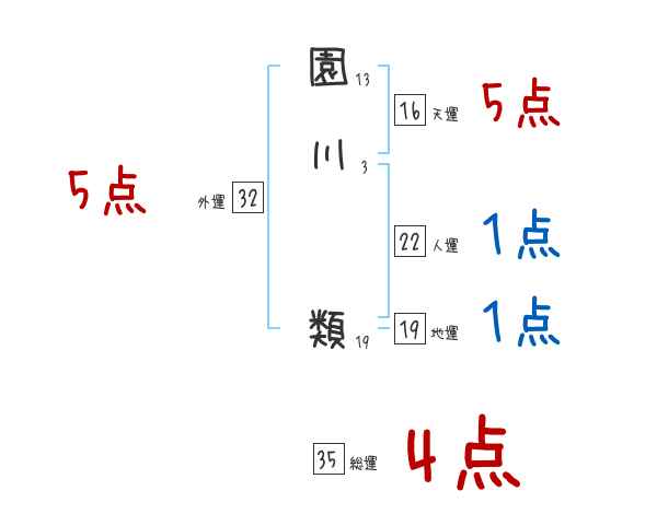 外運![]() | 園川類さんの外運は32画の5つ星!柔軟性があり成功する。チャンスが多く金運が良い。 生活面を象徴する運勢です。外部から受ける影響力を表し、結婚運、家庭運や職場、環境への順応性を表します。 |