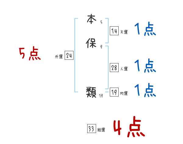外運![]() | 本保類さんの外運は24画の5つ星!家庭運が良く順調な人生。金運にも恵まれる。 生活面を象徴する運勢です。外部から受ける影響力を表し、結婚運、家庭運や職場、環境への順応性を表します。 |