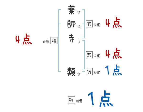 天運![]() | 薬師寺類さんの天運は35画の4つ星!温厚な性格で感受性が高い。穏和な性格で人望が厚い。 家系が持つ宿命的な運勢を表します。祖先から受け継いだ苗字ですので自分の力が及びません。家柄を象徴します。 |