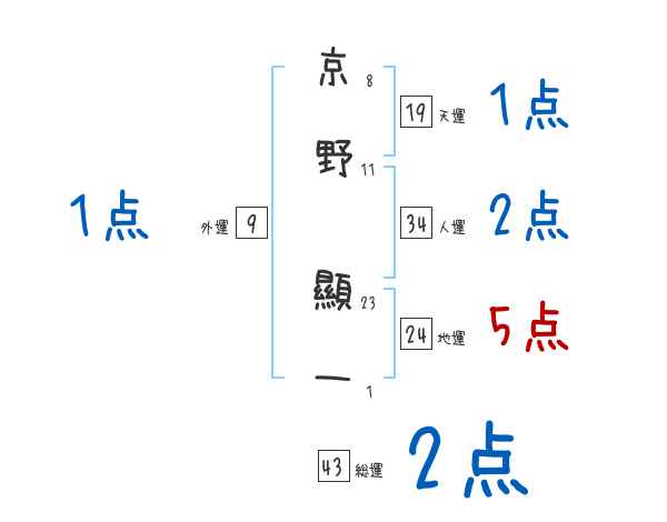 天運![]() | 京野顯一さんの天運は19画の1つ星!優れた才能を持ちますが、協調性が足りないことも。周りの人と協力する事を意識しましょう。 家系が持つ宿命的な運勢を表します。祖先から受け継いだ苗字ですので自分の力が及びません。家柄を象徴します。 |