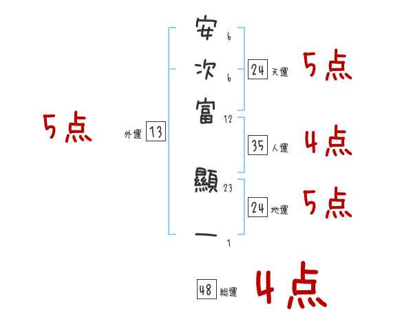 人運![]() | 安次富顯一さんの人運は35画の4つ星!温厚な性格で感受性が高い。穏和な性格で人望が厚い。 性格や才能などを表す2番目に重要な運勢です。人間関係や協調性、社会的な成功に影響します。主に20歳から50歳ぐらいまでの中年期の運勢を表します。 |