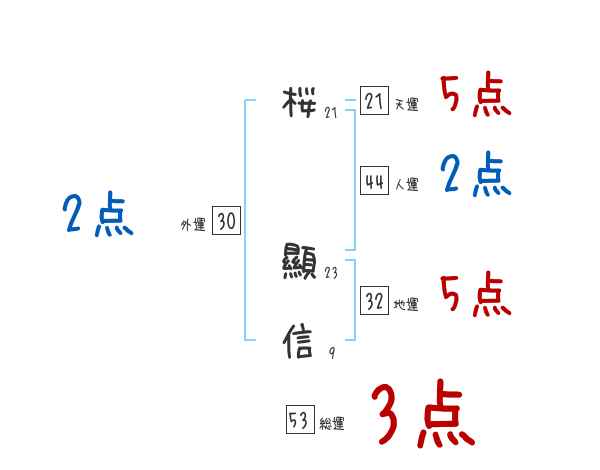 総運![]() | 桜顯信さんの総運は53画の3つ星!やや見栄っ張りで虚栄心がある。散財に注意。 あなたの人生を表す1番重要な運勢です。生涯を通じて影響する総合運となり、主に50歳以降の晩年期に影響を及ぼします。 |