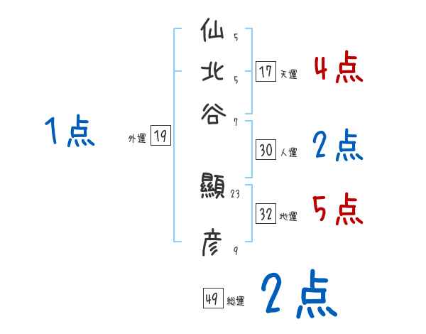 外運![]() | 仙北谷顯彦さんの外運は19画の1つ星!優れた才能を持ちますが、協調性が足りないことも。周りの人と協力する事を意識しましょう。 生活面を象徴する運勢です。外部から受ける影響力を表し、結婚運、家庭運や職場、環境への順応性を表します。 |