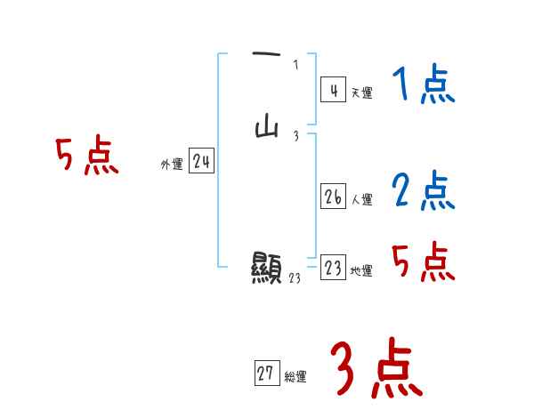 外運![]() | 一山顯さんの外運は24画の5つ星!家庭運が良く順調な人生。金運にも恵まれる。 生活面を象徴する運勢です。外部から受ける影響力を表し、結婚運、家庭運や職場、環境への順応性を表します。 |