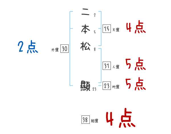外運![]() | 二本松顯さんの外運は30画の2つ星!浮き沈みの激しさに注意しましょう。 生活面を象徴する運勢です。外部から受ける影響力を表し、結婚運、家庭運や職場、環境への順応性を表します。 |