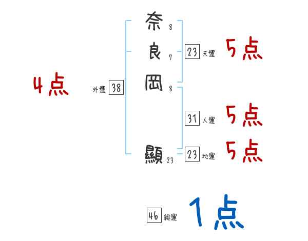 天運![]() | 奈良岡顯さんの天運は23画の5つ星!想像力に優れ活力がある。一代で成功し名誉を手に入れる。 家系が持つ宿命的な運勢を表します。祖先から受け継いだ苗字ですので自分の力が及びません。家柄を象徴します。 |