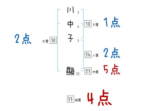 総運![]() | 川中子顯さんの総運は33画の4つ星!権力志向でプライドが高い。勇気があり運を切り開き成功する。 あなたの人生を表す1番重要な運勢です。生涯を通じて影響する総合運となり、主に50歳以降の晩年期に影響を及ぼします。 |
