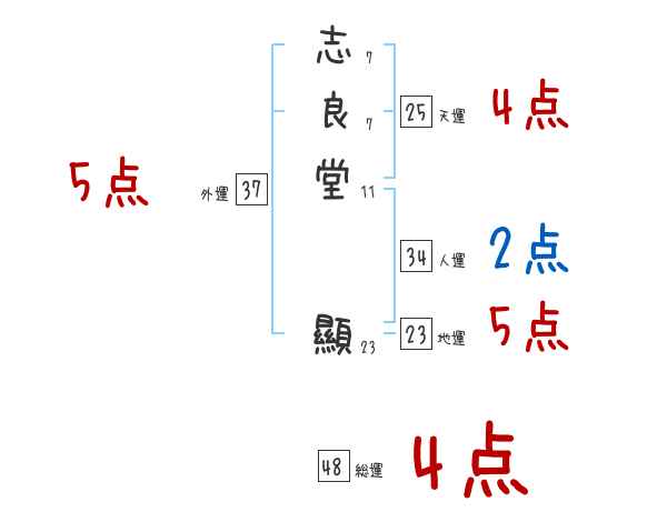 地運![]() | 志良堂顯さんの地運は23画の5つ星!想像力に優れ活力がある。一代で成功し名誉を手に入れる。 個性を表す基礎的な運勢です。性格形成や対人関係、行動力など家庭環境に影響されます。主に誕生してから20歳くらいまでの若年期の運勢を表します。 |