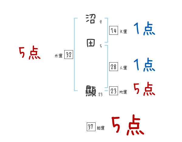 外運![]() | 沼田顯さんの外運は32画の5つ星!柔軟性があり成功する。チャンスが多く金運が良い。 生活面を象徴する運勢です。外部から受ける影響力を表し、結婚運、家庭運や職場、環境への順応性を表します。 |