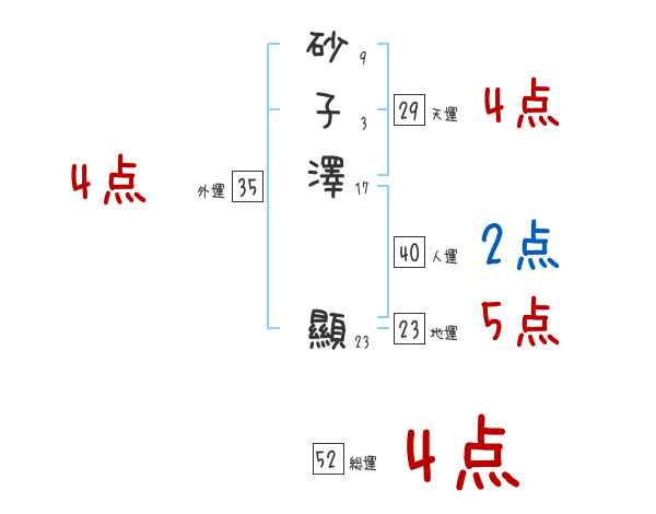 外運![]() | 砂子澤顯さんの外運は35画の4つ星!温厚な性格で感受性が高い。穏和な性格で人望が厚い。 生活面を象徴する運勢です。外部から受ける影響力を表し、結婚運、家庭運や職場、環境への順応性を表します。 |