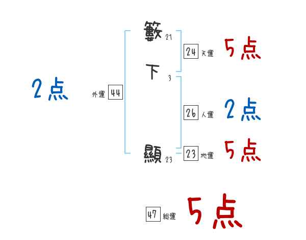 天運![]() | 籔下顯さんの天運は24画の5つ星!家庭運が良く順調な人生。金運にも恵まれる。 家系が持つ宿命的な運勢を表します。祖先から受け継いだ苗字ですので自分の力が及びません。家柄を象徴します。 |