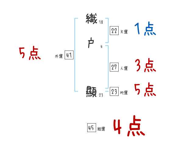 天運![]() | 織戸顯さんの天運は22画の1つ星!努力することが苦手ないっぽう手先が器用。芸術性にも優れる。 家系が持つ宿命的な運勢を表します。祖先から受け継いだ苗字ですので自分の力が及びません。家柄を象徴します。 |