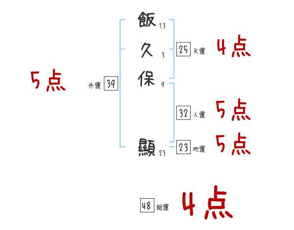 外運![]() | 飯久保顯さんの外運は39画の5つ星!社交性に優れ人望が厚い。人の上に立ち成功する。 生活面を象徴する運勢です。外部から受ける影響力を表し、結婚運、家庭運や職場、環境への順応性を表します。 |