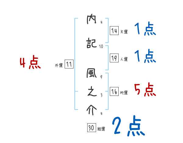 地運![]() | 内記風之介さんの地運は16画の5つ星!人望が厚く大きく発展する。逆転成功が見える。 個性を表す基礎的な運勢です。性格形成や対人関係、行動力など家庭環境に影響されます。主に誕生してから20歳くらいまでの若年期の運勢を表します。 |