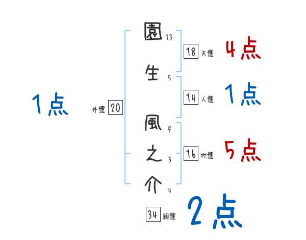 総運![]() | 園生風之介さんの総運は34画の2つ星!独創性に優れるが、自尊心が強く災難に注意しましょう。 あなたの人生を表す1番重要な運勢です。生涯を通じて影響する総合運となり、主に50歳以降の晩年期に影響を及ぼします。 |