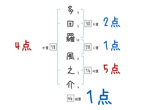 天運![]() | 多田羅風之介さんの天運は30画の2つ星!浮き沈みの激しさに注意しましょう。 家系が持つ宿命的な運勢を表します。祖先から受け継いだ苗字ですので自分の力が及びません。家柄を象徴します。 |