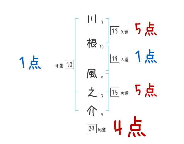 人運![]() | 川根風之介さんの人運は19画の1つ星!優れた才能を持ちますが、協調性が足りないことも。周りの人と協力する事を意識しましょう。 性格や才能などを表す2番目に重要な運勢です。人間関係や協調性、社会的な成功に影響します。主に20歳から50歳ぐらいまでの中年期の運勢を表します。 |