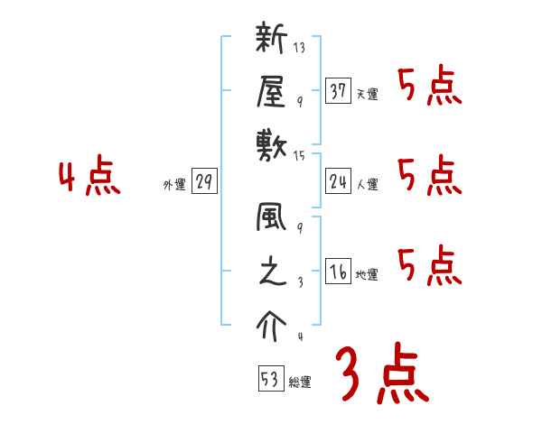総運![]() | 新屋敷風之介さんの総運は53画の3つ星!やや見栄っ張りで虚栄心がある。散財に注意。 あなたの人生を表す1番重要な運勢です。生涯を通じて影響する総合運となり、主に50歳以降の晩年期に影響を及ぼします。 |