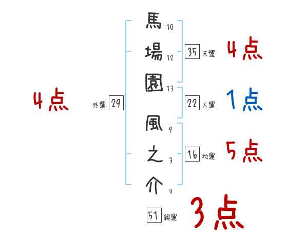 地運![]() | 馬場園風之介さんの地運は16画の5つ星!人望が厚く大きく発展する。逆転成功が見える。 個性を表す基礎的な運勢です。性格形成や対人関係、行動力など家庭環境に影響されます。主に誕生してから20歳くらいまでの若年期の運勢を表します。 |
