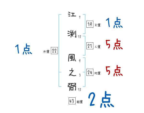 人運![]() | 江渕風之弼さんの人運は21画の5つ星!統率力がある。独立し成功する。名誉を手に入れる。 性格や才能などを表す2番目に重要な運勢です。人間関係や協調性、社会的な成功に影響します。主に20歳から50歳ぐらいまでの中年期の運勢を表します。 |