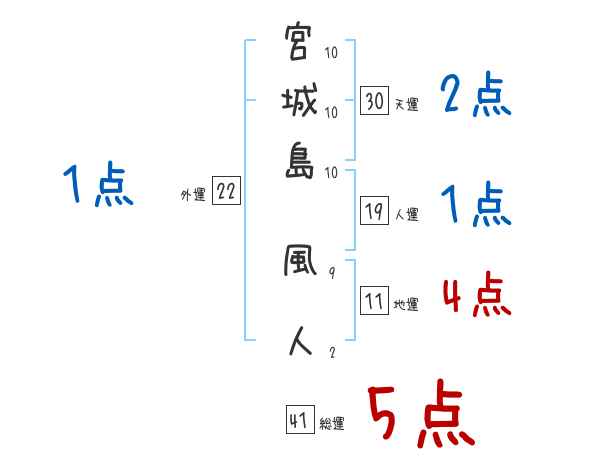 天運![]() | 宮城島風人さんの天運は30画の2つ星!浮き沈みの激しさに注意しましょう。 家系が持つ宿命的な運勢を表します。祖先から受け継いだ苗字ですので自分の力が及びません。家柄を象徴します。 |