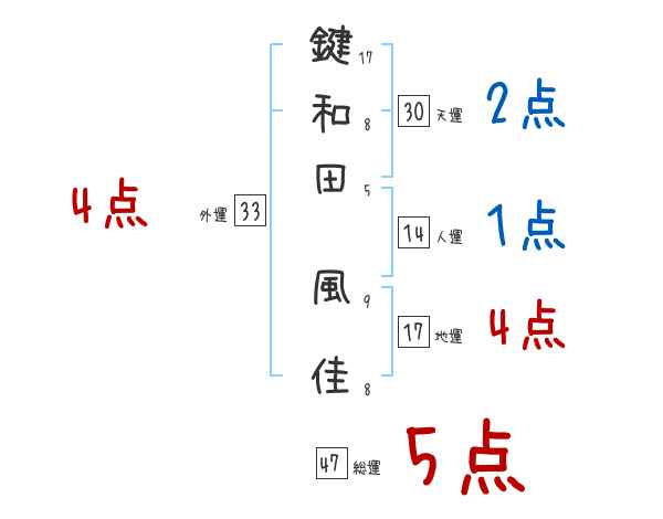 総運![]() | 鍵和田風佳さんの総運は47画の5つ星!実力が開花し発展する円満な人生。財に恵まれる。 あなたの人生を表す1番重要な運勢です。生涯を通じて影響する総合運となり、主に50歳以降の晩年期に影響を及ぼします。 |