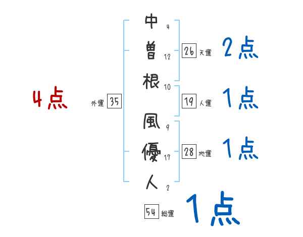 人運![]() | 中曽根風優人さんの人運は19画の1つ星!優れた才能を持ちますが、協調性が足りないことも。周りの人と協力する事を意識しましょう。 性格や才能などを表す2番目に重要な運勢です。人間関係や協調性、社会的な成功に影響します。主に20歳から50歳ぐらいまでの中年期の運勢を表します。 |