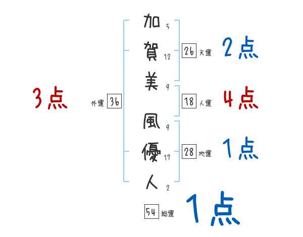 | 総運  | 加賀美風優人さんの総運は54画の1つ星!トラブルが多いかも。周りをよく見て協調して過ごしましょう。あなたの人生を表す1番重要な運勢です。生涯を通じて影響する総合運となり、主に50歳以降の晩年期に影響を及ぼします。 |