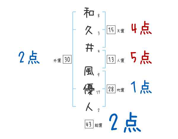 外運![]() | 和久井風優人さんの外運は30画の2つ星!浮き沈みの激しさに注意しましょう。 生活面を象徴する運勢です。外部から受ける影響力を表し、結婚運、家庭運や職場、環境への順応性を表します。 |