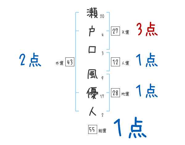 | 外運  | 瀬戸口風優人さんの外運は43画の2つ星!頑固な性格で独立心が強いかも。やや非現実的で浪費に注意しましょう。生活面を象徴する運勢です。外部から受ける影響力を表し、結婚運、家庭運や職場、環境への順応性を表します。 |