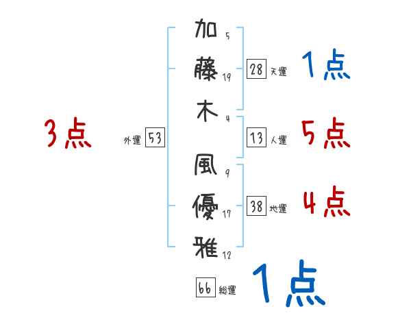 天運![]() | 加藤木風優雅さんの天運は28画の1つ星!家庭環境に注意。スポーツで活躍できる能力があるかも。 家系が持つ宿命的な運勢を表します。祖先から受け継いだ苗字ですので自分の力が及びません。家柄を象徴します。 |