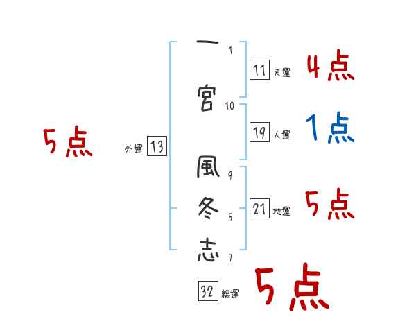 天運![]() | 一宮風冬志さんの天運は11画の4つ星!着実に富や地位を得る幸運な人生。 家系が持つ宿命的な運勢を表します。祖先から受け継いだ苗字ですので自分の力が及びません。家柄を象徴します。 |
