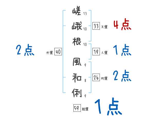 天運![]() | 嵯峨根風和俐さんの天運は33画の4つ星!権力志向でプライドが高い。勇気があり運を切り開き成功する。 家系が持つ宿命的な運勢を表します。祖先から受け継いだ苗字ですので自分の力が及びません。家柄を象徴します。 |